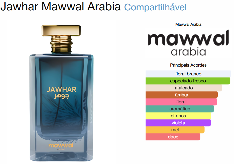 Mawwal Jawhar é uma fragrância unissex luxuosa, refinada e envolvente. Composta por um buquê floral doce-amadeirado que se revela desde a primeira borrifada, mistura o calor do mel e do âmbar ao frescor da rosa e das flores brancas.